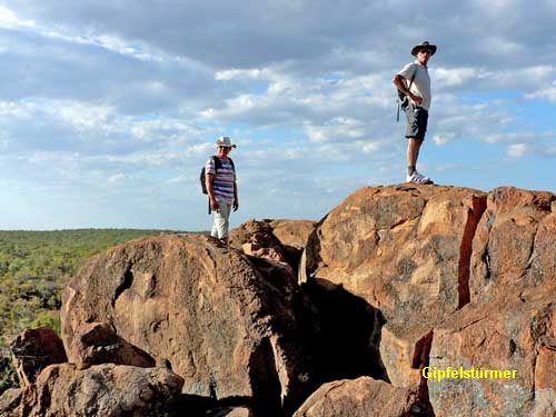 Undara begrüßt uns am Tag mit Hitze. Die Klimaanlage im Camper läuft pausenlos. In der Nacht brauchen wir die Schlafsäcke. Es ist kalt. Und windig. Beim Bushwalk lernen wir die lästigen Fliegen kennen. Helmut ist der Meinung, dass man an sich ranschmieren kann, was man will, die fressen alles! Hildegund hat statt dessen einen elektronischen Pieper aus Deutschland am Kittel. Hilft auch nicht. Vermutlich piept das Ding deutsch, und das verstehen die Viecher nicht. |