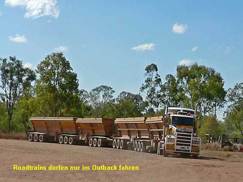 Unsere erste längere Fahrt führt uns von der Küste ins Outback zu den Lavatubes von Undara! Weiter werden wir uns nicht in die Einöde vorwagen. Auf der Fahrt begegnen uns Roadtrains mit über fünfzig Metern Länge, die keinen Millimeter vom Asphalt weichen. Wir flüchten stets in unserer eigenen Staubwolke auf den unbefestigten Seitenstreifen. Traudel findet das sowieso besser. Die Dreckwolke dieser Riesen würde uns wohl ersticken.