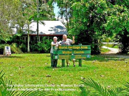 16. Oktober Der Morgen empfängt uns mit kaltem, feuchtem Wetter. Eilig verlassen wir die Gegend, verlieren uns aus den Augen und treffen uns nach etlichen SMS- und Telefonierversuchen erst an der Küste wieder. Vor allem wir sind gespannt auf das nächste Ziel, Mission Beach, Antjes temporärem Wohn- und Arbeitsort. Erster Eindruck: So riesig haben wir uns den Ort nicht vorgestellt. Wir kreuzen eine Weile umher, bis wir den gewünschten Campingplatz ansteuern. Der Stellplatz unter Palmen und riesigen Gummibäumen ist traumhaft exotisch. Zu schön, um bald weiter zu reisen. |