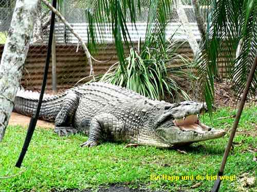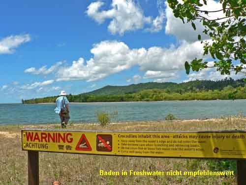 Sechzig Kilometer nördlich von Mission Beach liegt Innisfail. Die dortige Krokodilfarm ist uns einen Ausflug wert. Schließlich sind außer den Reptilien auch Kassuwaries zu bewundern, eine vom Aussterben bedrohte australische Straußenart, die sich in Mission Beach überall im Buschwerk verstecken soll. Wir haben nicht das Glück, einen von ihnen bei einem Bushwalk anzutreffen. Allerdings bin ich, Herbert, beinahe auf einen ein Meter großen Leguan getappt. Der lag einfach so auf dem Weg. Keine Ahnung, ob das Biest gefährlich ist! Es bewegt sich nicht, beobachtet mich aber genau aus den Augenwinkeln. Ich schleiche jedenfalls langsam rückwärts und suche mir sicherheitshalber einen Stock. Dann erst traue ich mich vorsichtig vorbei. Auf der Krokodilfarm treffen wir gerade rechtzeitig zur Fütterung ein. Es ist beeindruckend, wie die mächtigen Tiere regungslos daliegen und dann mit enormer Geschwindigkeit nach einem blutigen Federvieh schnappen. Kauen tun sie nicht. Die Hühner marschieren wohl so wie sie sind in den Magen. Man hätte keine Chance, einen Arm rechtzeitig wegzuziehen!!! Zur Belustigung fragt mich der Tierpfleger, woher ich komme. Er hat wohl geahnt, dass ich Deutscher bin. Jedenfalls berichtet er den Umstehenden, dass Deutsche gutes Futter für die Krokodile seien. Na, Mahlzeit! Warum? Das sei gut für den Umsatz. Wenn das in der BILD-Zeitung stände, kämen die Urlauber aus Deutschland in Scharen und wollten den Ort der Grausamkeit besichtigen. Bei anderen Ländern klappe das nicht .... Meine Bedenken, dass ich zu zäh sei, akzeptiert er nicht. Nach diesem Schreck fahren wir auf einen Cappucino nach Freshwater an den Strand. Herrliche Gegend. Baden ist leider nicht drin. Warum? Warning for Crocodiles! |
