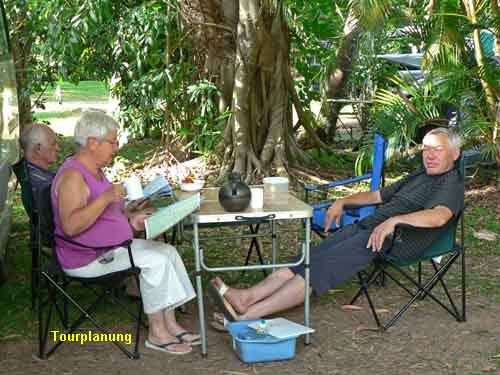 Interessant sind die Gespräche mit den zahlreichen Backpackers. Wir treffen die jungen Leute als Kellnerinnen, Servicepersonal bei Ausflügen und auf den Campingplätzen an. Erstaunlich, wie viele junge Frauen aus Deutschland in Oz arbeiten. Sei es im Rahmen des Programms „Work And Travel“ oder als befristete Arbeitskraft für zwei Jahre. Arbeit findet sich schnell, und Deutsche sind nach unseren Informationen besonders begehrt. Die Arbeitswoche hat allerdings sechs Tage, und unter fünfzig Stunden geht nichts. Die Arbeit ist hart (Zementfabrik, Bananenplantage, Apfelernte). Wer einen Monat lang pünktlich erscheint, bekommt vierhundert Dollars extra. |