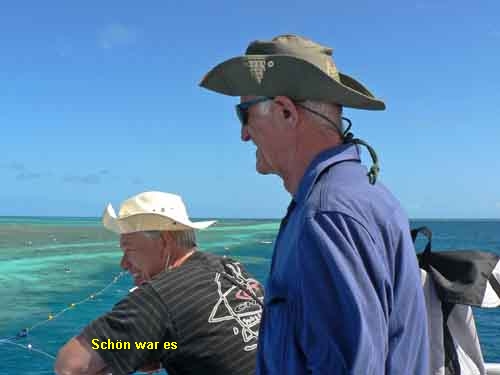 Zu dritt – Traudel mit optischen Gläsern in einer geliehenen Maske - erobern wir das Reef. Wir streifen uns jeder einen sexy Stingeranzug, das sind Ganzkörper-Strumpfhosen, bis über die Ohren. So sind wir vor den Tentakeln der giftigen Quallen und Sonnenbrand geschützt. Hildegund entscheidet sich stattdessen für eine Fahrt mit einem Glasbodenboot.