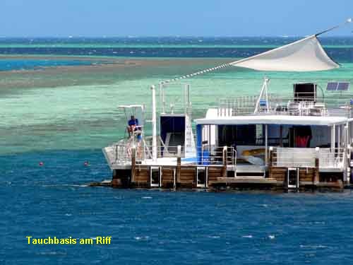 Später stehen wir auf dem Sonnendeck der Basis und betrachten das Reef von oben. Das Wasser leuchtet in Grün-, Blau- und Türkistönen bis hin zu kitschig. Unter uns füttern Besatzungsmitglieder die Fische mit Leckerbissen, damit sie ihr Domizil an dieser Stelle beibehalten. Besonders keck verhält sich ein kleiner Hai, der es lange nicht begreifen will, dass die Leckerli alle sind.