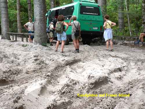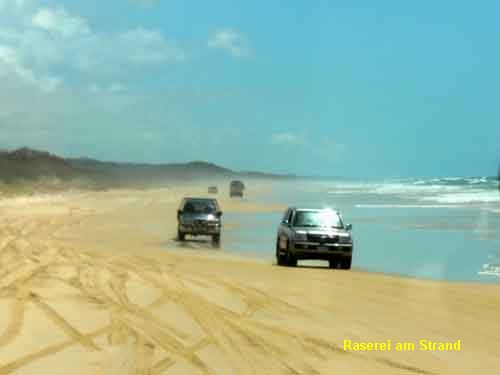 Das Weltnaturerbe Fraser Island ist ein „Muss“ für den Sunshine-State-Besucher. An dieser Stelle bricht die Kontinentalplatte ab, und der Pazifik wird 4000 m tief. Dank der vielen Wasserzuflüsse ist das Meer sehr fischreich, was von den Haien besonders geschätzt wird. Wer hier baden geht, sollte sich überlegen, wie er sich ohne Unterkiefer und Arme weiter ernähren kann – falls er zu diesen Überlegungen überhaupt noch kommt. Natürlich ist die Insel ein Eldorado für Angler! Wie hinkommen? Die Insel hat keine Straßen, nur Sandpisten der übelsten Sorte. Wir buchen einen Tagesausflug und werden im 4-Wheel-Drive-Bus kutschiert. Papierbeutel für angegriffene Mägen sind im Preis inbegriffen. Was werden wir hin- und hergeschleudert! Der Bus schiebt sich zeitweise schräg durch den Sand. Auf der Meerseite der Insel beobachten wir verrückte Jeepfahrer, die den Strand als Rennbahn benutzen. Mehr als 100 km/h sind auch hier nicht erlaubt – solange sich die Strandpolizei blicken lässt. Noch verrückter ist die Tatsache, dass bei Ebbe gleichzeitig Flugzeuge auf dem harten Sand landen. |