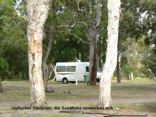 Beim Frühstück lärmen die Papageien über uns. Das Meer rauscht, der Wind versucht, die Wurst vom Gummibrot zu wehen. Auf dem Wasser landet ein Pelikan. Es ließe sich aushalten, wenn nur der Campingtisch beim Wurstschneiden nicht so wackeln würde! Der Kaffee schwappt regelmäßig über.