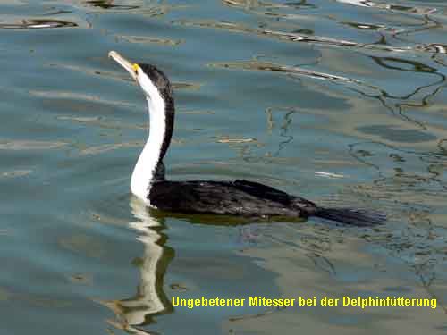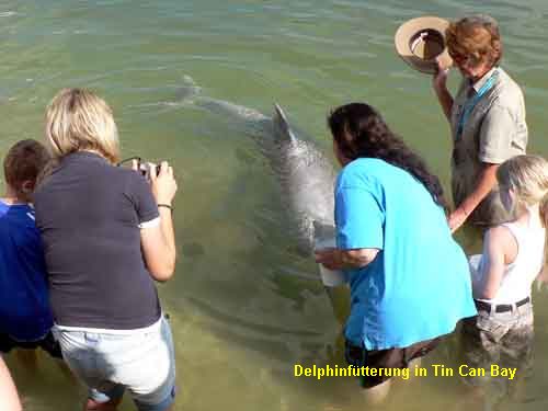 In Tin Can Bay steht eine Delphinfütterung auf dem Programm. Zwei dieser Menschenfreunde kommen im Hafen bis an den Strand. Wer will, erhält einen Fisch und darf sich im Wasser aufreihen. Die Delphine schwimmen dann von Touri zu Touri und holen sich die Fische. Wirklich witzig! |