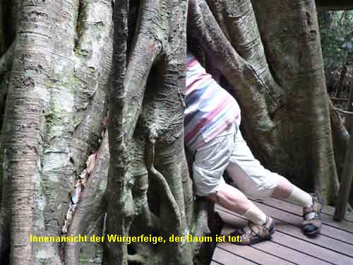 Meter tiefe Schluchten, blicken ins Innere einer Würgerfeige, deren Wirt schon vor über hundertfünfzig Jahren abgestorben ist, und staunen einmal mehr über die üppige Vegetation. Hier auf fast tausendzweihundert Metern Höhe unterscheidet sie sich sehr von den Eukalyptuswäldern in den Tälern. Die Luft ist so frisch, dass im Garten des Gästehauses sogar Rhododendren blühen. |