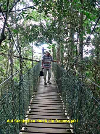 Bevor wir in den Regenwald eintauchen, überqueren wir die Futterstelle für Papageien. Das erinnert ein wenig ans Tauben füttern im Park. Wir gehen auf Zehenspitzen, um nicht auf die bunten Vögel zu treten. Dann marschieren wir über einen Plankenweg zu den Hängebrücken, die uns auf Wipfelhöhe durch den Regenwald führen. Wir überqueren bis zu hundertzwanzig