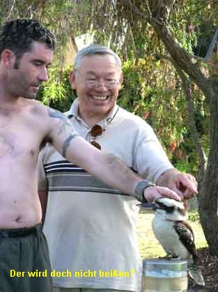 Auch heute morgen strahlt die Sonne vom Himmel. Vor unserem Wohnmobil findet sich eine Sippe Papageien ein, bettelt um Krumen. Als nichts kommt, stieben sie laut schimpfend davon. Auf einem Pfahl wenige Meter von uns sitzt ein zahmer Kookaburra, der sich sogar streicheln lässt.