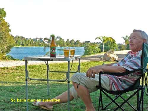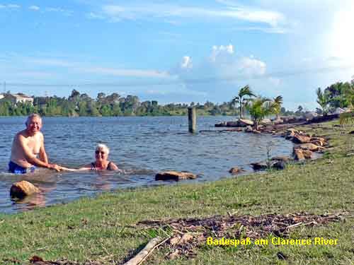Ein „Take Away“ wirbt mit Kaffee und einer schnellen Mahlzeit. Wir bestellen zwei Cappuccino und zwei Teller „Fish and Chips“ plus Salat. Das Essen sei in zehn Minuten fertig, heißt es. Super! Wir sollen ein wenig spazieren gehen, einen Blick auf den Fluss werfen, der durch einen kleinen Park getrennt entlang der anderen Straßenseite dahin fließt. Machen wir! Das Ufer lädt mit seinen Bänken und Bäumen zum Verweilen ein. Der Wind fächelt angenehm, und der Blick aufs Wasser beruhigt. Das I-Center nebenan hat einen Internetzugang, den wir nach dem Essen nutzen wollen. Seit zwei Tagen trage ich den Stick mit neuen Beiträgen in der Hosentasche herum. Plötzlich ertönt die Stimme des Kochs hinter uns: „Your Lunch is ready!“ Na, welch ein Service! Der nette Mann holt uns zum Essen ab. Und das alles für nur 25 AUS$! Der Kaffee weckt die Lebensgeister. Wir wollen noch bis Grafton fahren. Traudel kurbelt die Scheiben hoch. Der Fahrtwind ist zu warm. Wir finden einen idyllischen Campingplatz am Clarence River, wo wir die einzigen Gäste sind. Bevor wir ein erfrischendes Bad im Fluss nehmen, erkundige ich mich vorsichtshalber nach Krokodilen, was mit hellem Gelächter beantwortet wird. Na dann, so lässt es sich aushalten! |