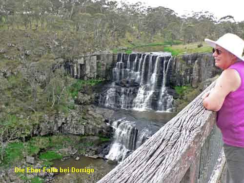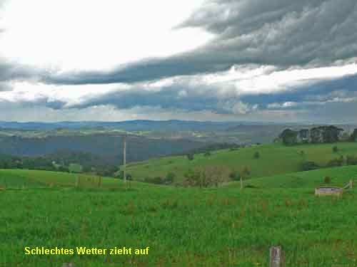 Von Grafton führt uns der Weg abseits der Küste über schmale Straßen durch die weite Hügellandschaft via Dorrigo nach Ebor. Der Umweg lohnt sich. Am Ziel gibt es nicht nur einen eindrucksvollen „Outlook“ mit viel Landschaft, sondern es empfängt uns ein weiterer rauschender Wasserfall. Nach einem Spaziergang und kurzer Rast brechen wir wieder auf, um auf enger, kurvenreicher Straße hinunter zur Küste zu fahren. Der Himmel wird schwarz, dunkle Wolken ziehen auf, Nebel umgibt uns, und Blitze zucken durch die Wolken. Es beginnt heftig zu regnen. Unsere Klimaanlage schafft es nicht, die beschlagenen Scheiben frei zu blasen. Vorsichtig tasten wir uns durch den Regenwald talwärts. Von der als eindrucksvoll beschriebenen Landschaft sehen wir nicht viel. Zudem sind unsere Gedanken beim Kühlschrank, der nicht richtig arbeitet. Die nette Dame im Infocenter von Dorrigo vermittelt uns an Apollo, die eine Werkstatt in Coffs Harbour vorschlagen. Aber dort kann man uns nicht helfen, es wird empfohlen, Richtung Sydney weiter zu fahren. Inzwischen ist es beinahe sechs Uhr, uns bleibt gerade noch Zeit, einen Campingplatz anzusteuern. Südlich von Coffs Harbour finden wir einen feuchten Übernachtungsplatz. Wir vermuten, Helmuts Wünsche nach einem Sauwetter wurden erhört ... |