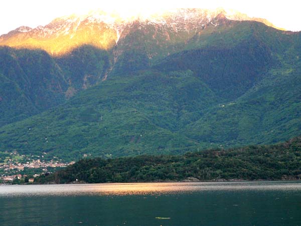 Am Abend: Alpenglühen über dem See, das Wasser ohne jede Welle